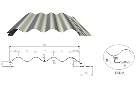 ● HL38-315型隱藏釘式墻板,使用展開寬度為500mm的彩涂板,適合厚度0.5-0.7mm。適應(yīng)于橫鋪墻面。表面為波浪型,承載能力強(qiáng)、外觀新穎、美觀大方,獨(dú)特的防水性能,主要適用于辦公樓、工業(yè)廠房、大型的公共建筑物墻面。